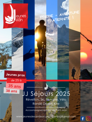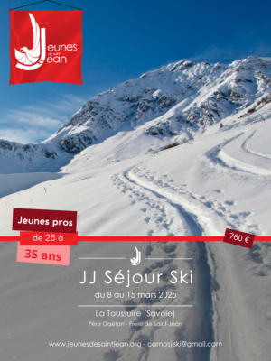 Les inscriptions sont complètes Concept : Le séjour JJ Ski, c’est une semaine à dévaler les pistes entre jeunes professionnels accompagnés par un Frère de Saint-Jean. C’est également une semaine pour se ressourcer par la prière, les topos et la sainte Messe célébrée chaque jour. Une semaine pour se déconnecter du quotidien, se rencontrer et […]...