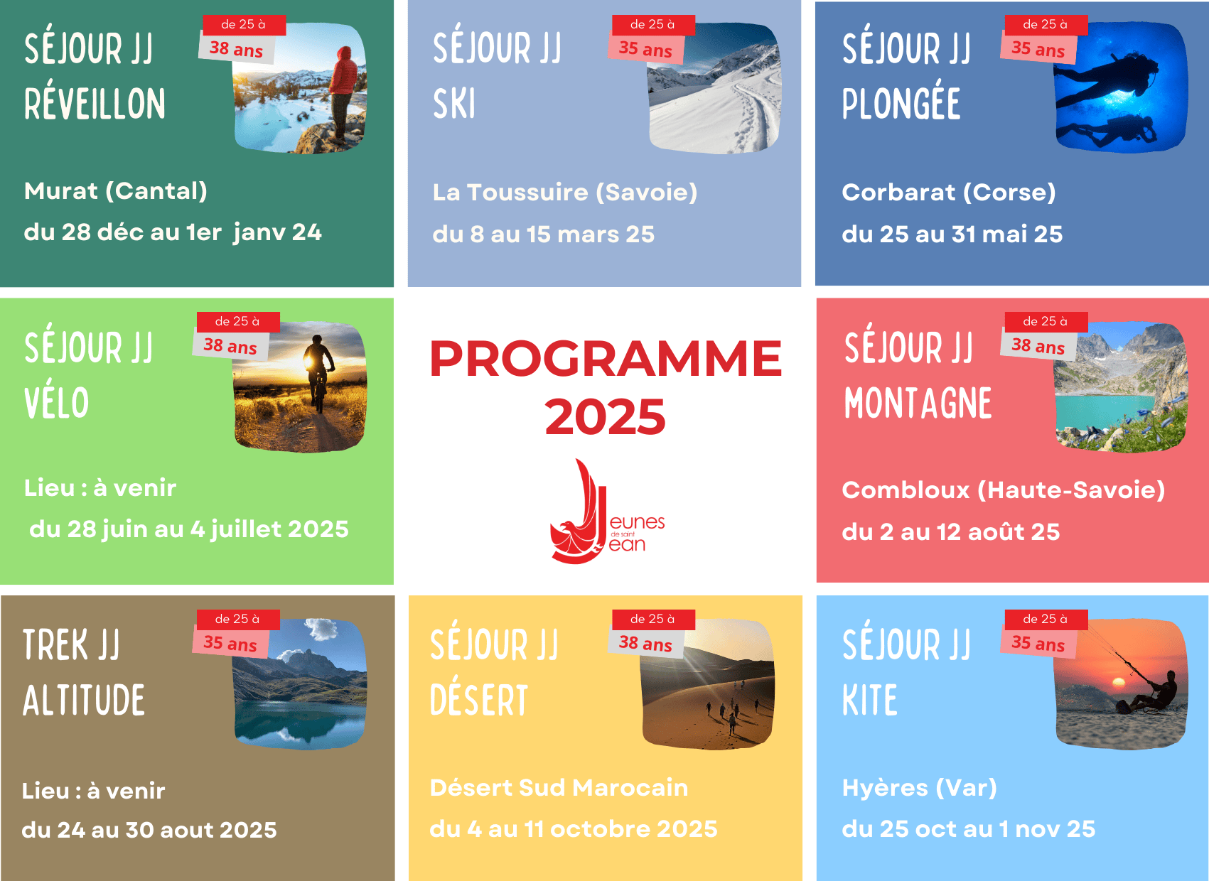 JJ séjour 2025 – Programme Complet ! Publié le 21 janvier 202516 novembre 2025 Date du séjour Année 2025 Age requis de 25 à 38 ans Catégorie 2025 Tu es un jeune professionnel catho et tu cherches un séjour sport & spi ? Tu es au bon endroit !! Tu trouveras ci-dessous le programme des séjours JJ 2025 !